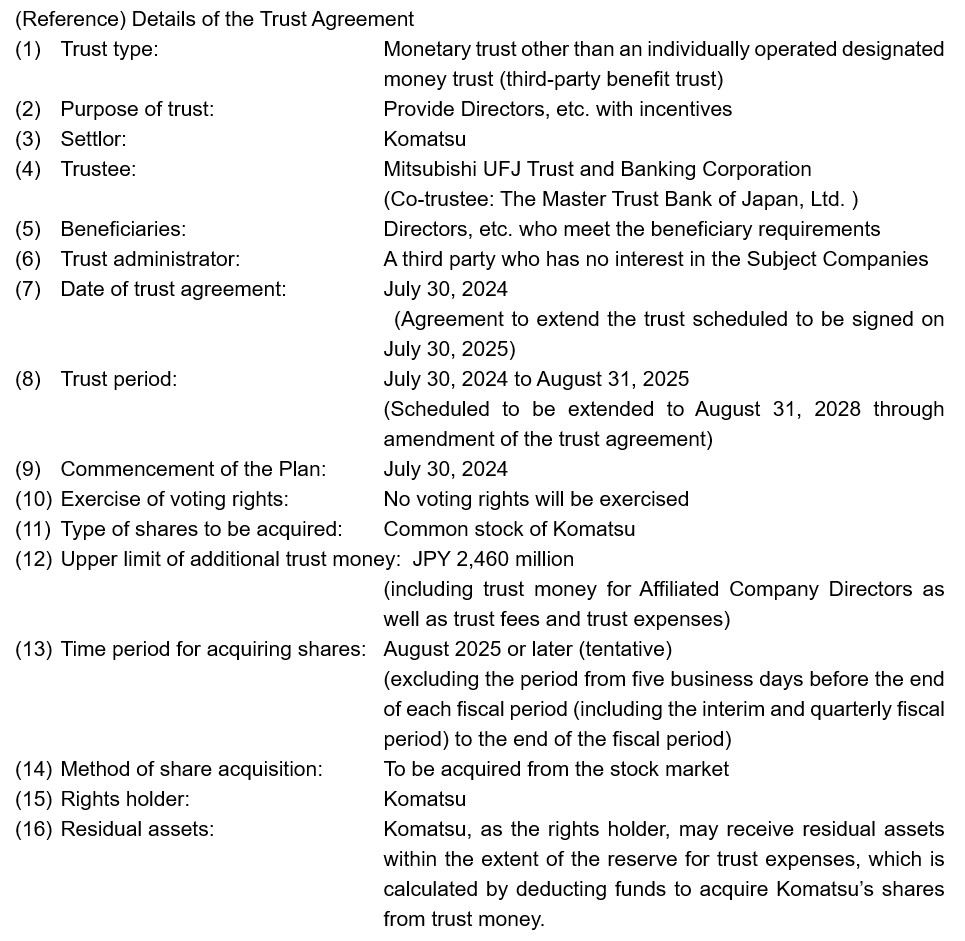 Upon expiry of the trust period, Komatsu may continue the BIP Trust by making amendments to the trust agreement and making additional contributions to the BIP Trust. In such case, in principle, a new Subject Period will be established for the corresponding business years in Komatsu’s mid-term management plan at that time, and the trust period of the BIP Trust will be extended for the period corresponding to the new Subject Period. Each of the Subject Companies will make additional contributions to the BIP Trust within the upper limit of trust money for which approval by resolution of their respective Shareholders Meetings has been obtained and will continue awarding points and delivering, etc. Komatsu Shares, etc. to Directors, etc. during the new Subject Period. In such cases where such additional contributions are to be made when there are any of Komatsu’s shares (excluding Komatsu’s shares equivalent to points granted to Directors, etc. that are yet to be delivered, etc.) and money remaining in the trust assets (excluding funds corresponding to distributions kept in the trust equivalent to points allotted to Directors, etc. listed in (11), hereinafter referred to as “Residual Shares, etc.” together with Komatsu’s shares) at the last day of the trust period prior to the extension, the sum of the value of the Residual Shares, etc. and additional trust money to be contributed shall be within the upper limit of trust money for which approval by resolution of the Shareholders Meetings has been obtained. Such an extension of the trust period will not be limited to one time only, and the trust period for the BIP Trust may subsequently be re-extended in the same manner.