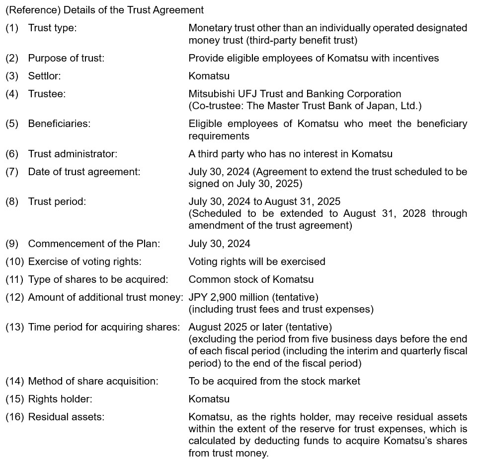 (4) Komatsu will continue implementing the Plan by making additional monetary contributions to the BIP Trust and ESOP Trust (hereinafter the “Trust”), which have already been established, and by having the Trust acquire the necessary shares of Komatsu from the stock market.