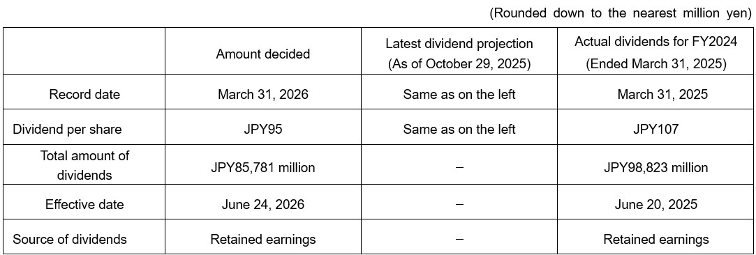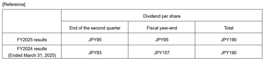 Concerning cash dividends for the fiscal year under review, after considering consolidated business results for the fiscal year under review and future business prospects under its dividend policy, the Company is planning to pay the year-end common stock dividend of JPY 95 per share, same as previous projection. Annual cash dividends should total JPY 190 per share, including the interim cash dividend which has already been paid, and which is the same amount as the previous fiscal year, ended March 31, 2025. Accordingly, the consolidated payout ratio will translate into 45.9%. This dividend amount will be proposed to the 157th ordinary general meeting of shareholders (scheduled for June 23, 2026).