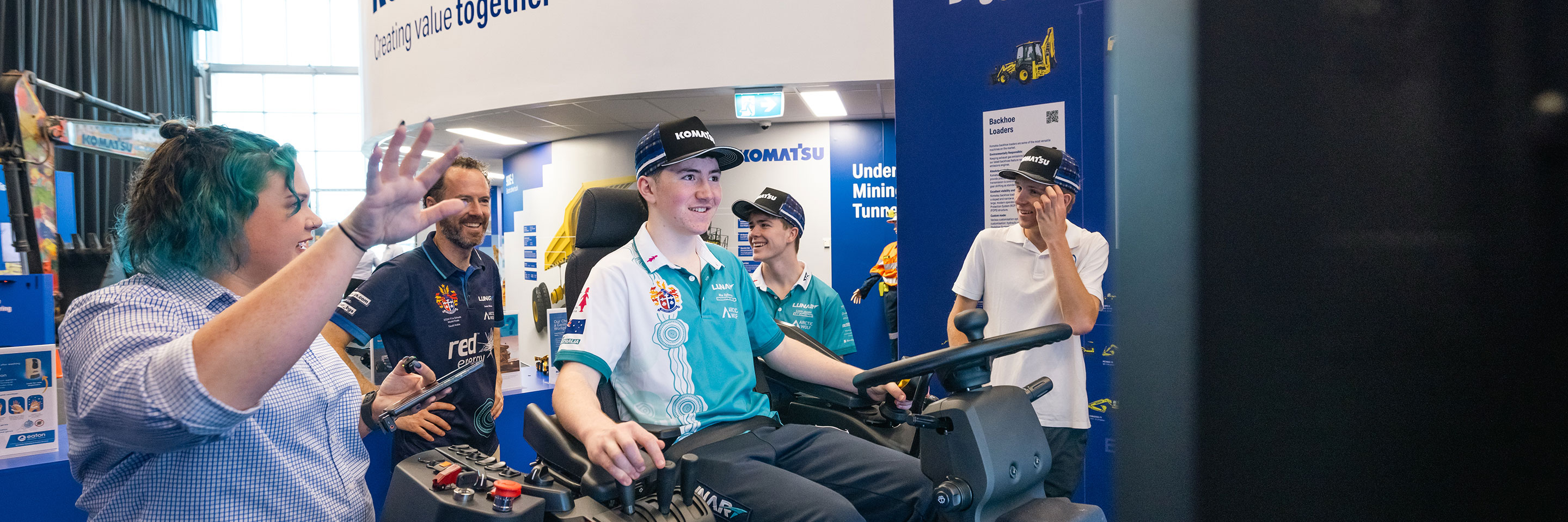 Komatsu-Williams Engineering Academy cohorts Maxwell Zylberman, Finn Snedden and Liam Jones check out Komatsu’s HM400-5 articulated dump truck at the Wacol facility, a major Australian hub for heavy equipment assembly, service and innovation.