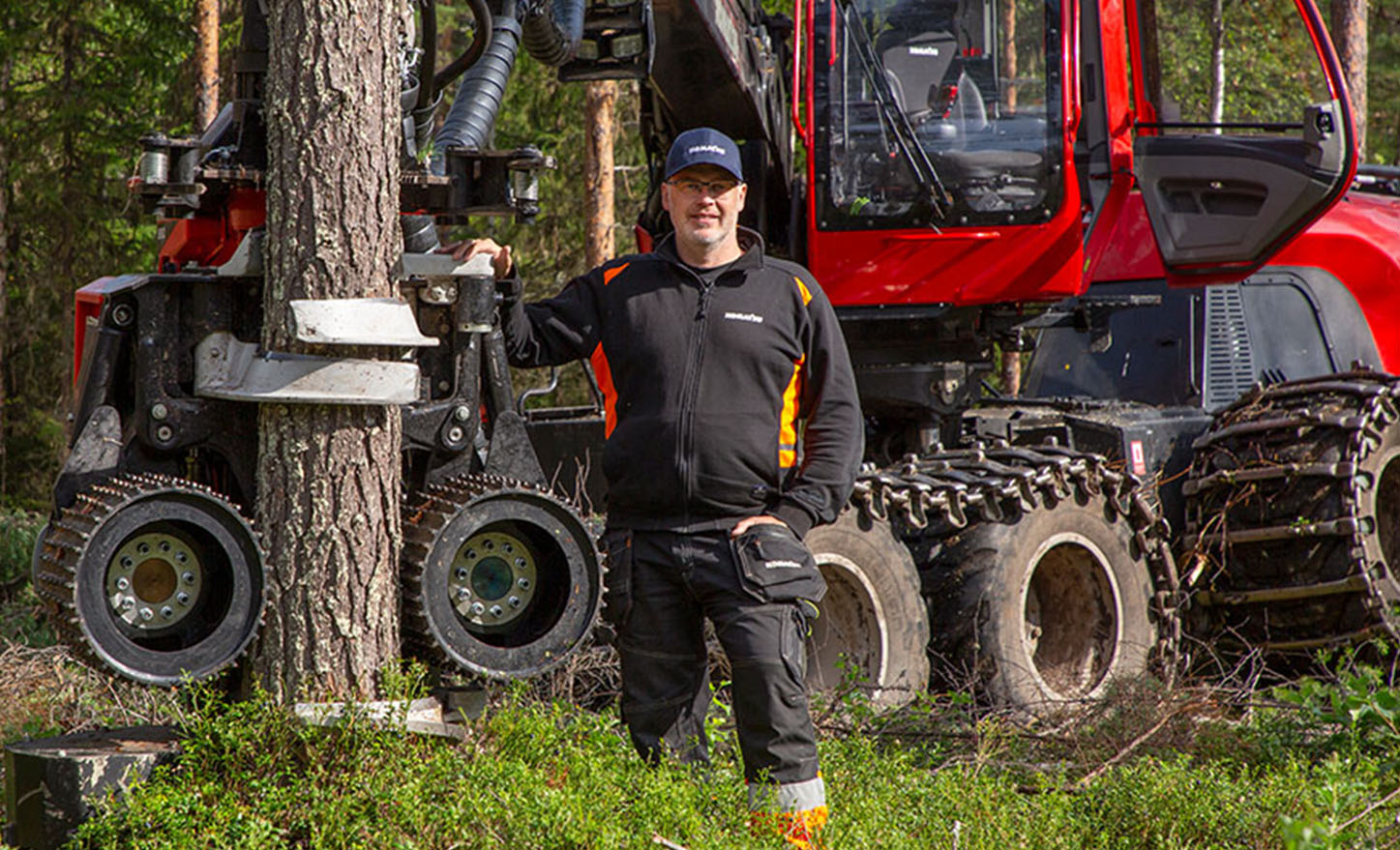 ヘニングソンはテクニカルサポート、トレーニング、マネジメント、テスト運転など、キャリアを通じて森林やオフィスで働いてきました。ここでは、S92 ハーベスターヘッドのテスト運転中に休憩を取っています。