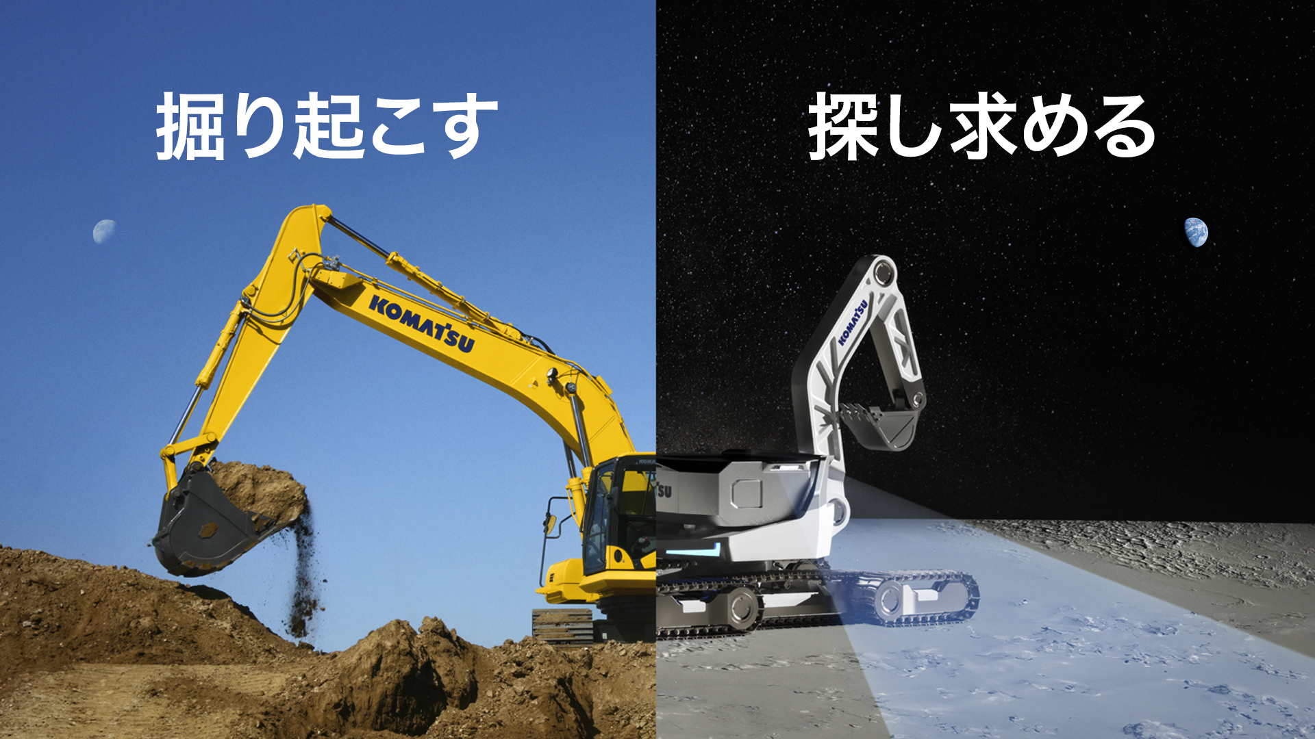 では地球の外にコマツのショベルを出してみましょうか。大地で行っていた土木作業がそのまま行えるでしょうか。