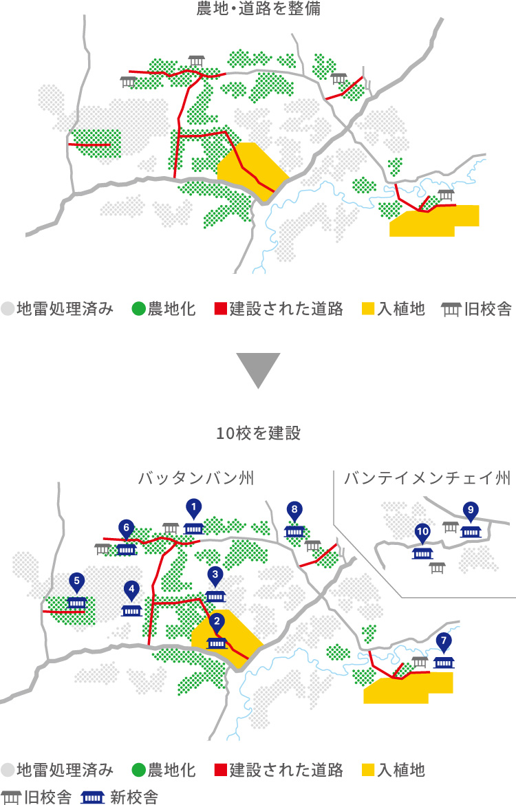2009年バッタンバン州の小学校建設を皮切りに、2022年の時点で10校目の建設が完了。危険な地雷原の中を歩くことも、雨で道路が水没し学校への道が閉ざされることもなくなった。すると子どもたちの目が輝き始めた。以前よりも笑顔が増えた。この場所から、たくさんの子どもたちが夢と希望を両手いっぱいに抱え、未来へ歩むことを私たちは切に願っている。