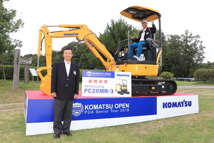 優勝副賞のPC20MR-3に乗って記念撮影をするパク ブーウォン選手と大会会長のコマツ代表取締役社長(兼)CEO大橋徹二