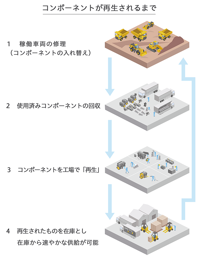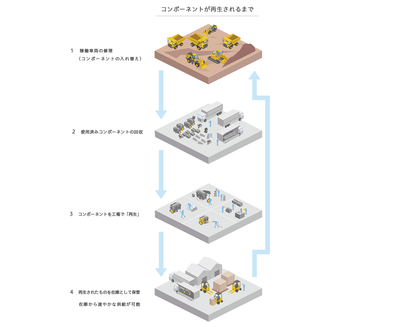 建機のコンポーネント*を自社で開発・生産している強みを活かして、使用済みコンポーネントを再生させる循環型ビジネスであり、「Remanufacturing/再生」を語源としています。