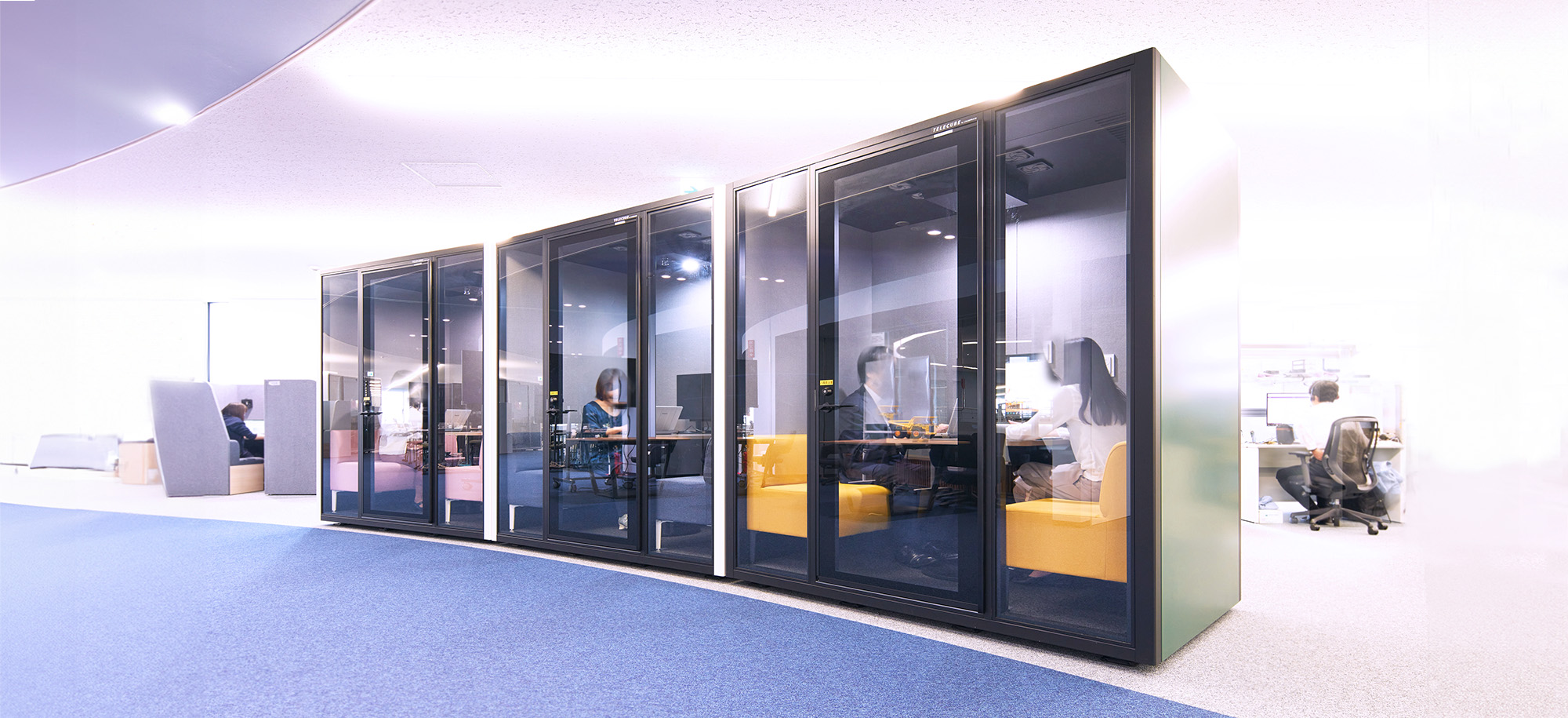 オープンスペースを数多く設けることで、普段はブース等を活用して自分の仕事に従事しながら、必要な時には時間や所属する部署に関係なく、すぐに集まってミーティングができるように設計されています。