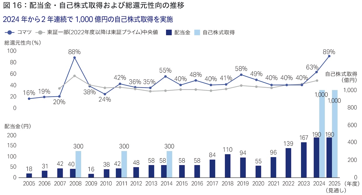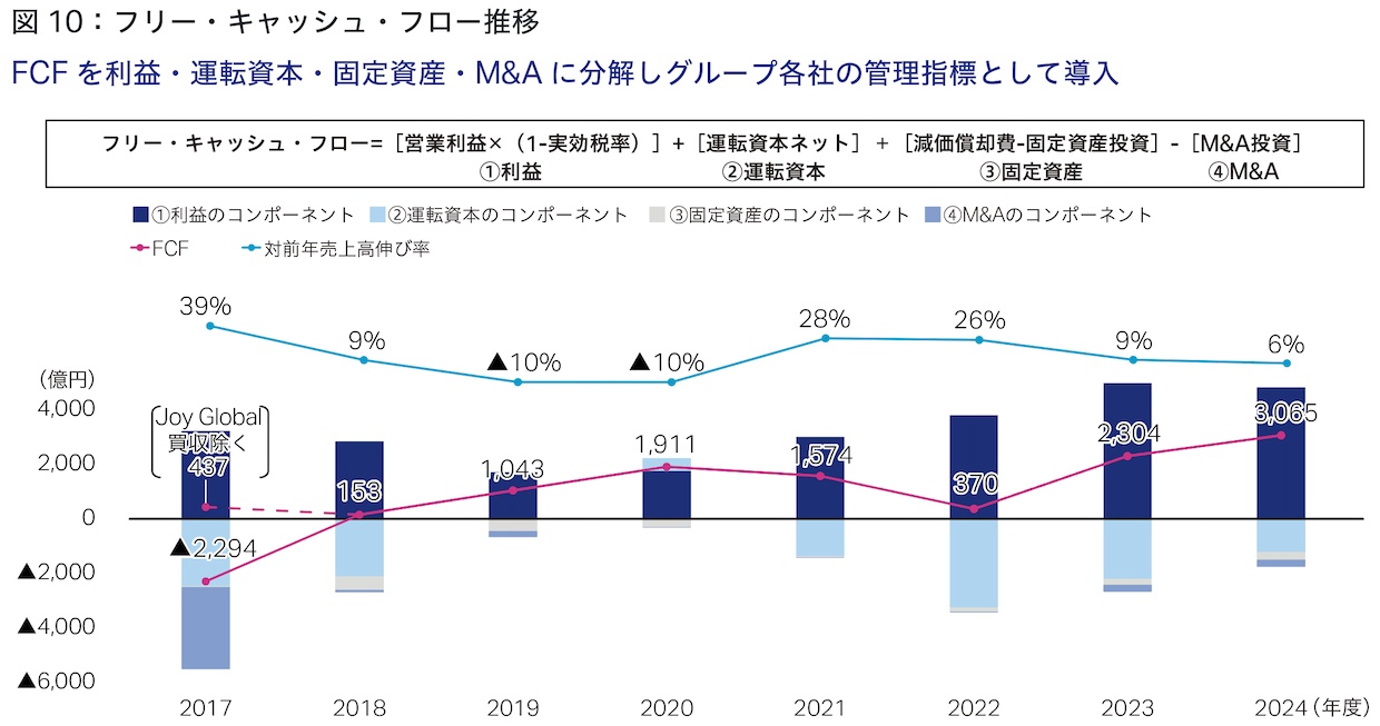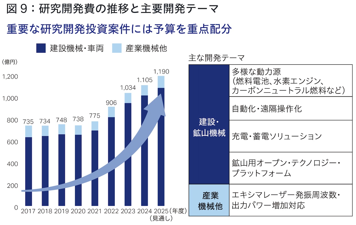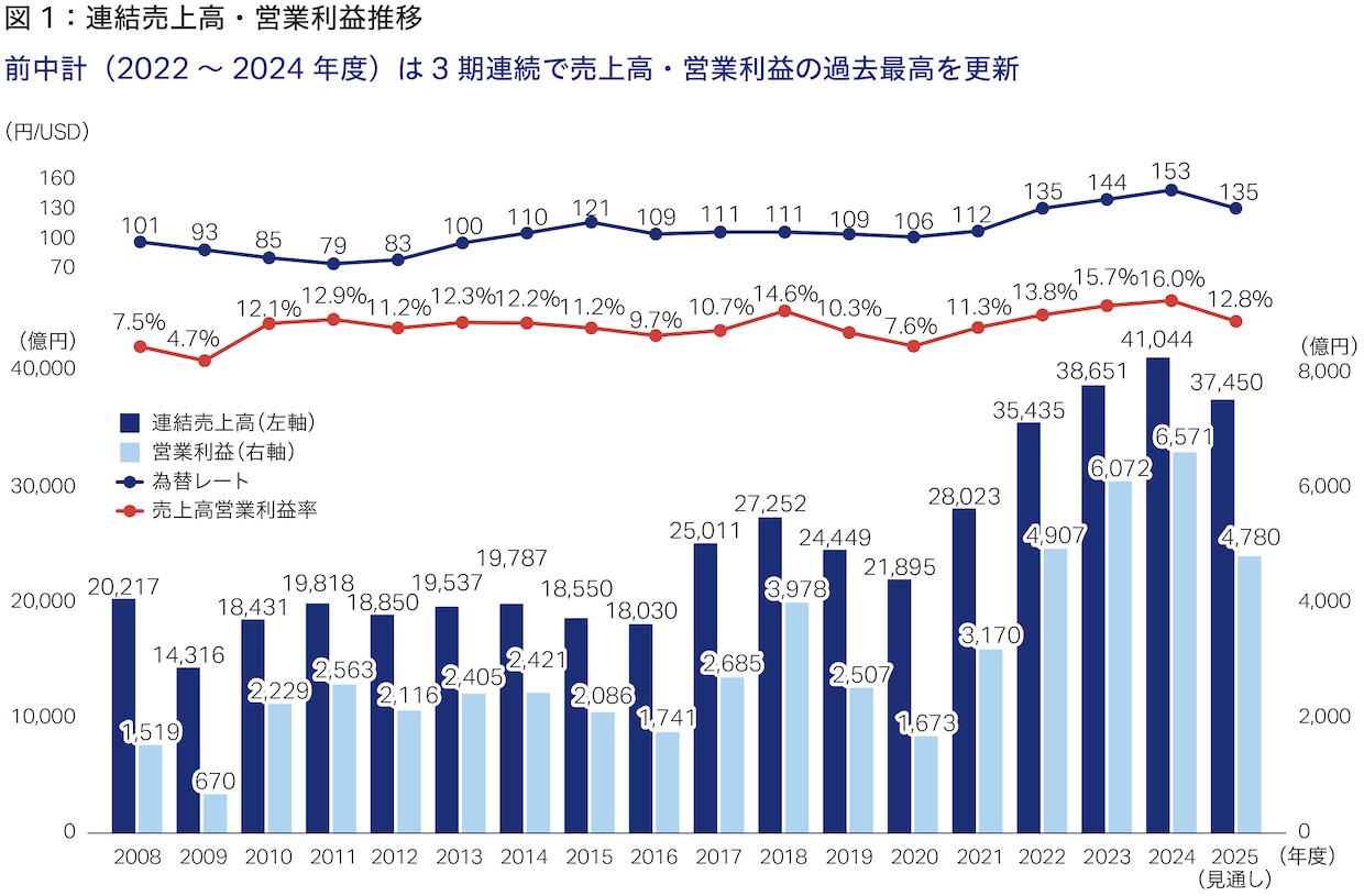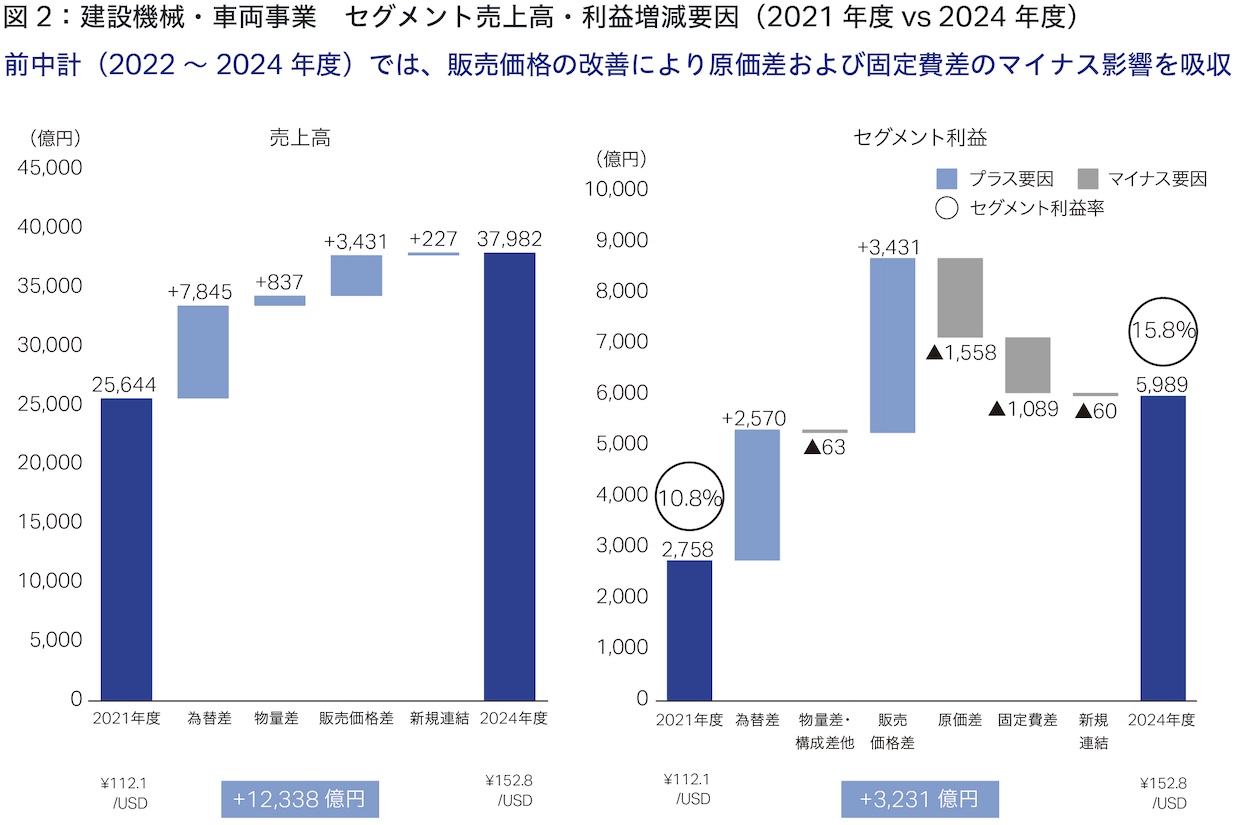前中期経営計画「DANTOTSU Value –Together, to “The Next” for sustainable growth」(以下、前中計)の3年間は、中国を除いた建設・鉱山機械の需要が3期連続で減少するという大変厳しい環境でした。しかし、インフレに伴う各国の政策金利引き上げによる円安の進行や、コストアップを吸収すべく販売価格の改善を強力に推進したことにより、売上高・営業利益は3期連続で過去最高を更新することができました(図1・2)。