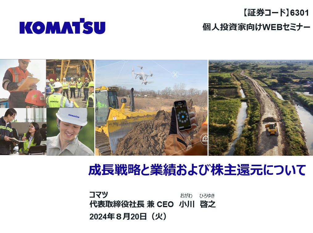 2024年8月20日にオンライン個人投資家説明会を開催しました。社長の小川よりコマツの概要、中期経営計画、業績および株主還元についてご説明いたします。 2024年8月20日収録