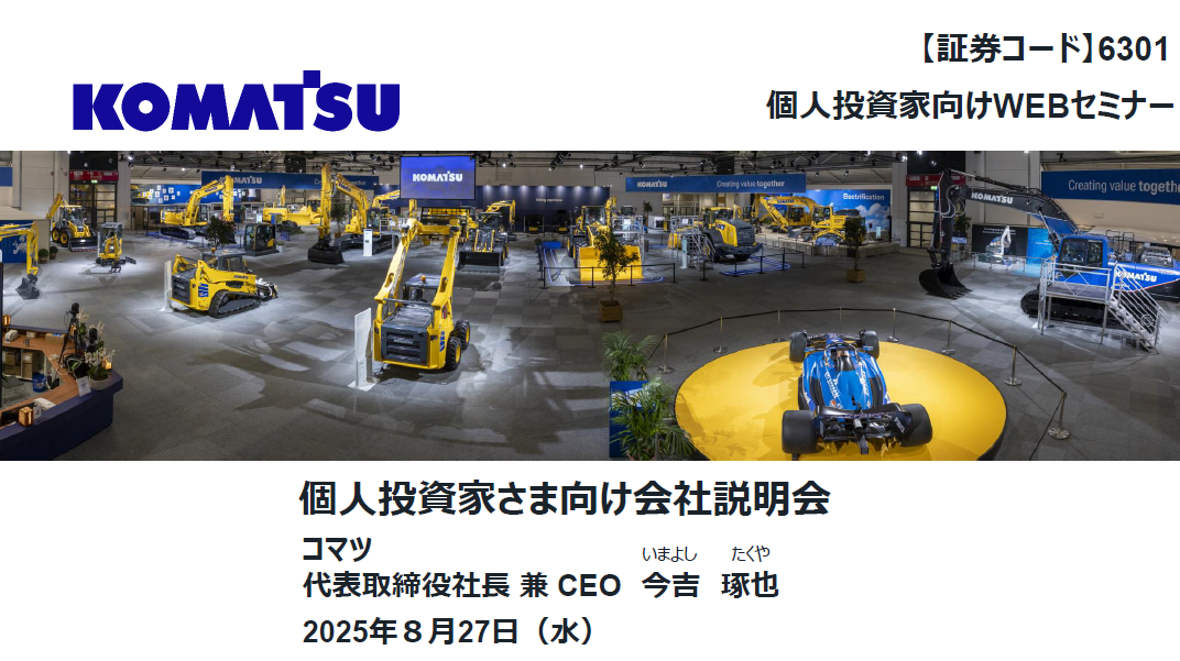 2025年8月27日にオンライン個人投資家説明会を開催しました。社長の今吉よりコマツの概要、中期経営計画、業績および株主還元についてご説明いたします。(約42分)