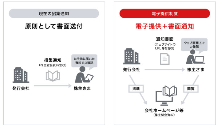 この制度により、株主総会に際して株主の皆さまにお送りする書類が変更となります。従来の株主総会資料(招集ご通知)に代わって、ウェブサイトへのアクセス方法等を記載した通知書面や補足資料等をお送りし、従来の株主総会資料はウェブサイト上にてご覧いただきます。