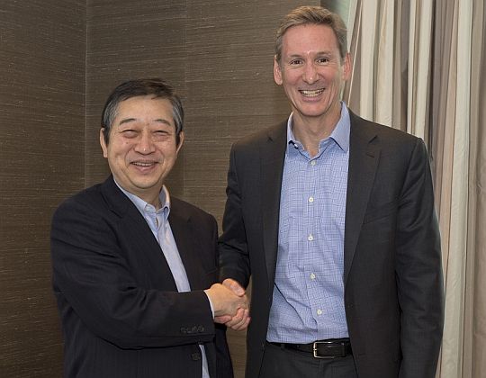 (左がコマツ社長 大橋徹二、右がカミンズCEO Tom Linebarger氏)