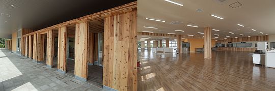 (左) [テラス部(CLT工法)]、 (右) [新食堂内部]