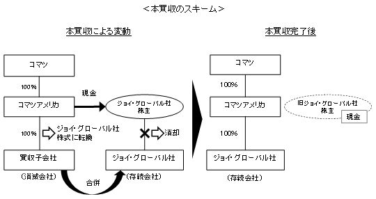 本買収は、コマツアメリカが本買収のために設立する完全子会社(以下「買収子会社」)とジョイ・グローバル社の合併による方法(逆三角合併)で実施します。合併後の存続会社はジョイ・グローバル社となり、合併対価としてジョイ・グローバル社の株主には以下の現金対価が交付される一方、コマツアメリカの保有する買収子会社の株式が存続会社の発行済み株式に転換されることにより、存続会社がコマツアメリカの完全子会社となります。本買収は、ジョイ・グローバル社が招集する株主総会における合併の承認および関係当事国において必要となる承認の取得、その他、合併契約に定める一般的な条件の充足により実施されます。なお、本買収のために当事者間で締結された合併契約において、コマツは、コマツアメリカおよび買収子会社による義務の履行につき保証を提供しています。