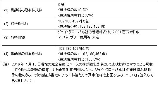 コマツ(本社:東京都港区、社長(兼)CEO:大橋徹二)は、米国における完全子会社であるコマツアメリカ株式会社(本社:米国イリノイ州、会長(兼)CEO:Rodney Schrader、以下「コマツアメリカ」)が、露天掘りおよび坑内掘り向け鉱山機械の製造・販売・サービスを行うJoy Global Inc.(本社:米国ウィスコンシン州、社長(兼)CEO:Edward L. Doheny II、以下「ジョイ・グローバル社」、米国ニューヨーク証券取引所上場)をコマツアメリカの完全子会社とすること(以下「本買収」)についてジョイ・グローバル社と合意することを本日の取締役会で決議しましたので、下記の通りお知らせいたします。今後、ジョイ・グローバル社の株主総会における承認、関連する国において必要となる承認取得を経た上で、2017年半ばを目処に本買収を完了する予定です。