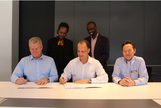 2016年10月21日、覚書に署名するKAfHのMike Blom社長(左)、カミンズアフリカのGino Butera副社長(中央)