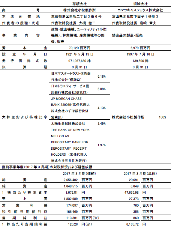 当社は、2018年2月15日開催の取締役会において、当社の完全子会社で鋳造品の製造・販売を行うコマツキャステックス株式会社(以下「コマツキャステックス」)を、2018年4月1日をもって吸収合併することを決議しましたので、下記の通りお知らせいたします。