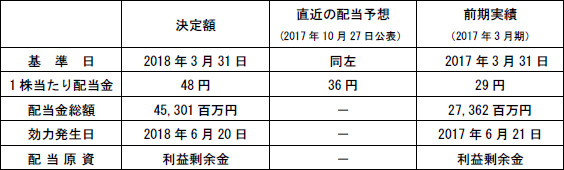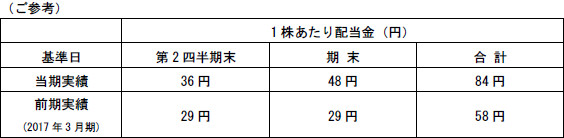 このような基本方針のもと、当期末の配当金につきましては、当期末までの業績ならびに今後の事業展開を勘案し、昨年10月27日に公表した前回予想から12円増額し、1株につき48円といたします。これにより、当期の年間配当金は、1株当たり84円となり、前期(2017年3月期)実績から26円増配となります。当該剰余金の配当は、第149回定時株主総会(本年6月19日開催予定)に提案する予定です。