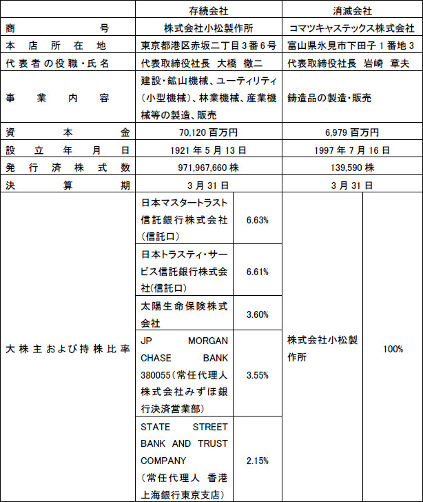 当社は、2018年6月19日開催の取締役会において、当社の完全子会社であるコマツキャステックス株式会社(以下「コマツキャステックス」)を、2018年10月1日をもって吸収合併することを決議しましたので、下記の通りお知らせいたします。