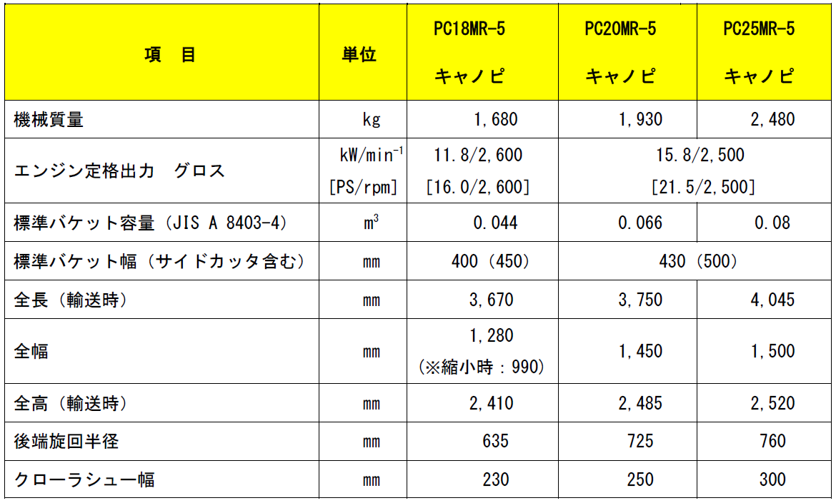 そのほか、機械質量について「PC20MR-5」は標準仕様だけでなく、キャノピ、アームクレーン仕様でも2t未満に抑えているほか、今回新たに2.5tクラスに追加した「PC25MR-5」は、フル装備(※2)でも3t未満に収まる設計です。それぞれ2tトラック、3tトラックで遵法輸送が可能で、高い輸送性を実現しています。