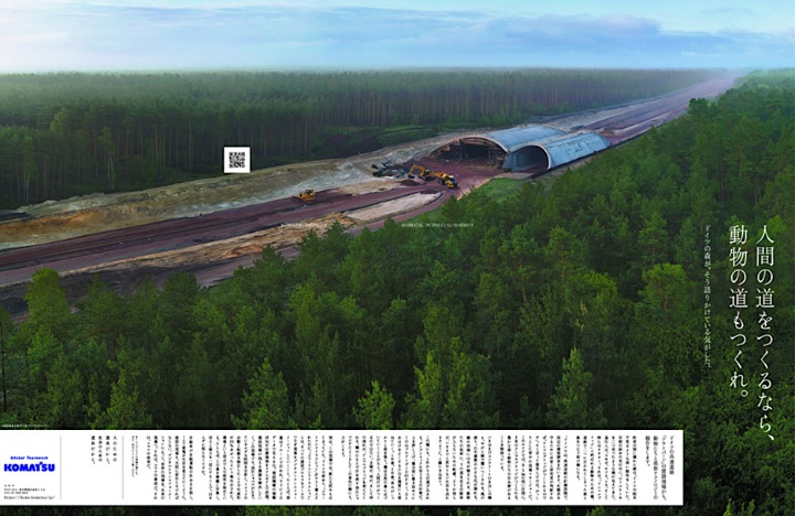 日経広告賞は1952年にスタートした日本の代表的な広告賞で、コマツは今回、「人間の道をつくるなら、動物の道もつくれ。~ドイツの森が、そう語りかけている気がした。~」(2019年6月17日 日本経済新聞朝刊掲載)の作品にて、「社会環境を人間中心で見るのではなく、動物など生きるものとの共存への貢献といえるような企業活動をアートと融合して美しく表現していた。人間の想像力が先にあってデータを動かすというコマツの意思、使命の表示である」との高い評価をいただきました。