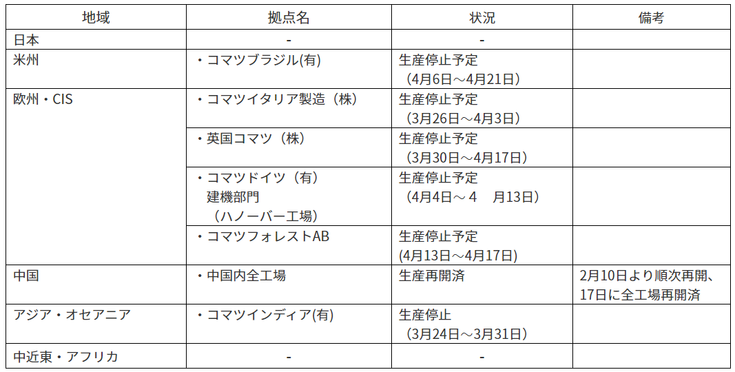 コマツグループは、各国政府の方針を受け、お客さま、地域の皆さまおよび社員の健康と安全を最優先に考慮し、感染拡大防止に努めており、このたび、各国政府の方針に従い一部工場において生産を停止しますので、以下の通りお知らせします。なお、稼働中の拠点においては、検温、マスク着用、時差出勤、出張禁止、在宅勤務等の対策を拠点ごとに実施しています。