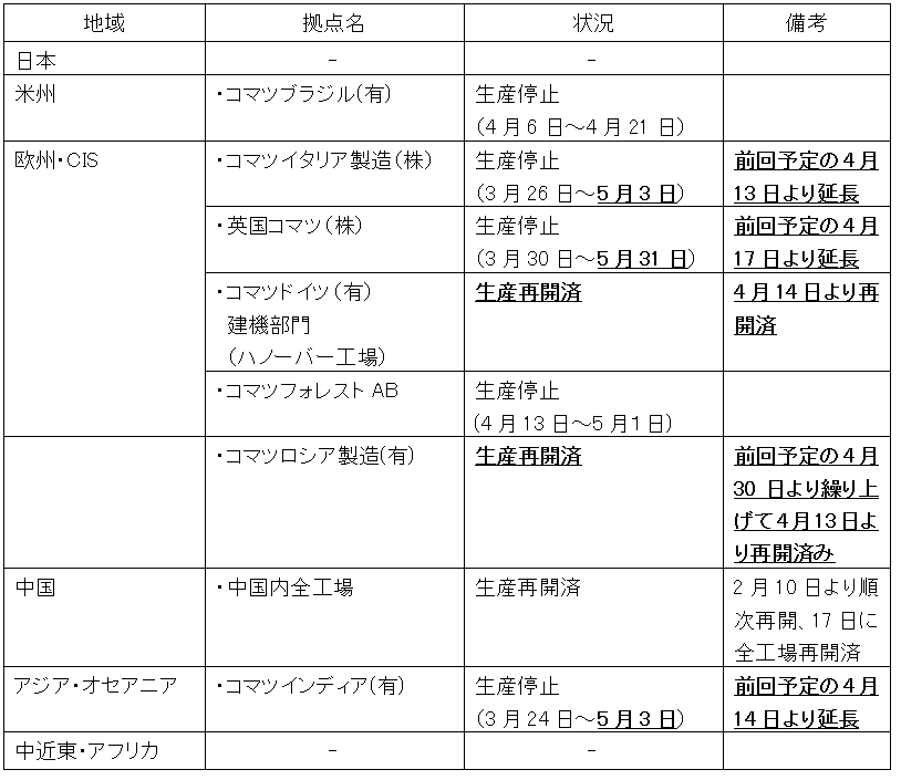 また、各国政府による規制が発令されている地域においては、お客さまの休業などの影響がでておりますが、一部の国において、建設・鉱山、農林業、物流などが、生活インフラを支える仕事(Essential business)として規制が緩和されはじめました。販売については日本、米州、欧州、アジア地域を中心に、販売代理店では在宅勤務による営業を継続していくとともに、お客さまへの商品・部品・サービスの継続的な供給のため、供給ルートの見直しやシフト体制等の対策を実施しております。
