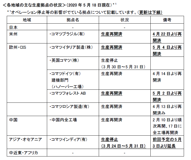 <各地域の主な生産拠点の状況>(2020年5月18日現在)*1