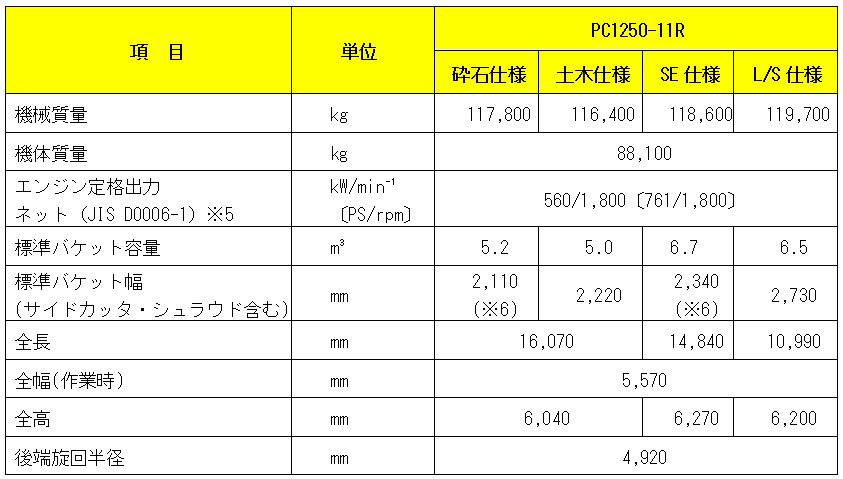【カタログ】 https://kcsj.komatsu/products/construction_machine/pdf/PC1250-11R.pdf
