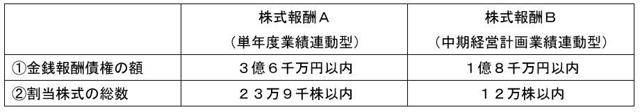 当社では、2018年6月開催の第149回定時株主総会において、当社の取締役(社外取締役を除きます。)に対する譲渡制限付株式報酬制度に係る、1事業年度当たりの報酬額および割当株式数として、下記のとおりご承認いただいております。