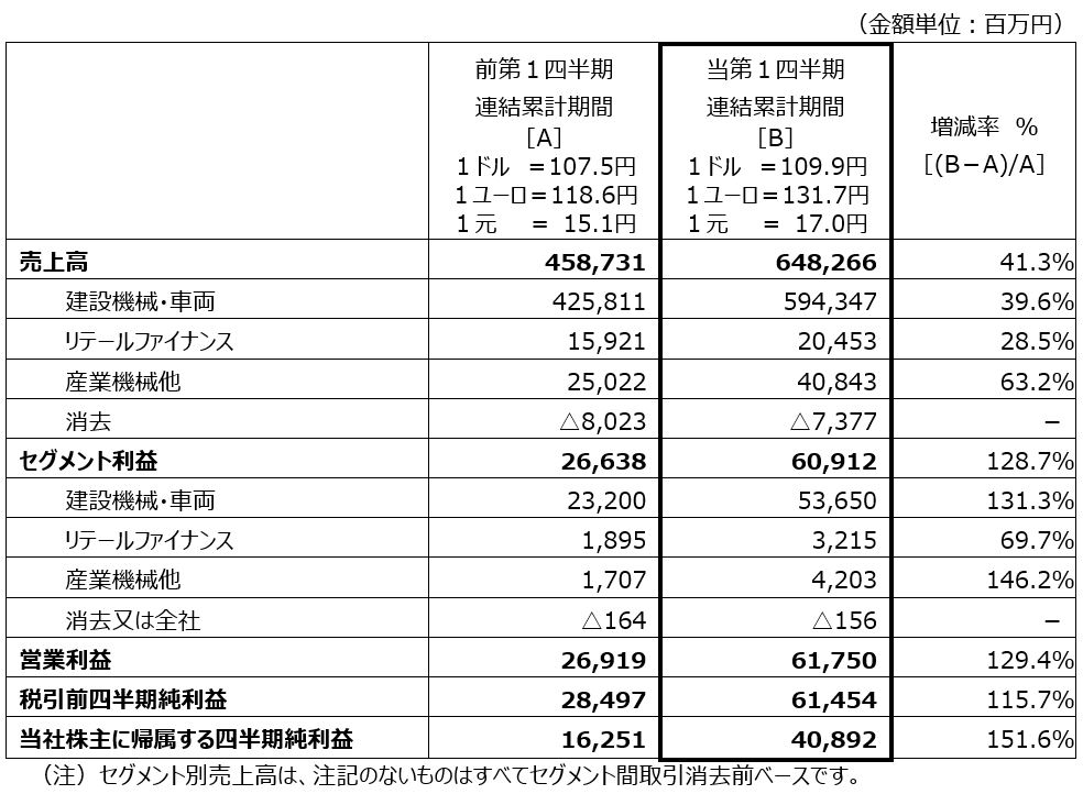 利益については、建設機械・車両部門における各地域での販売量増加や販売価格の改善、円安の影響により、営業利益は617億円(前年同期比129.4%増加)となりました。売上高営業利益率は前年同期を3.6ポイント上回る9.5%、税引前四半期純利益は614億円(前年同期比115.7%増加)、当社株主に帰属する四半期純利益は408億円(前年同期比151.6%増加)となりました。