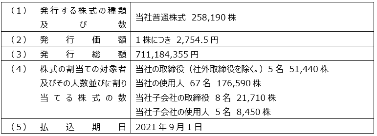 当社は、2021年7月16日開催の取締役会において決議されました、譲渡制限付株式報酬としての新株式の発行に関し、本日払込手続きが完了いたしましたので、下記のとおりお知らせいたします。本件の詳細につきましては、2021年7月16日付「譲渡制限付株式報酬としての新株式の発行に関するお知らせ」をご参照ください。
