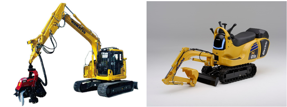 <写真左:PC138US-11ハーベスタC93仕様、写真右:Hondaと共同開発している電動マイクロショベル>