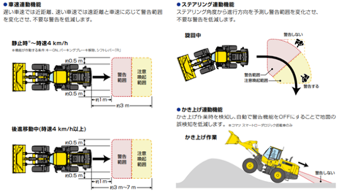 ホイールローダー向けに開発した車速連動機能、ステアリング連動機能、かき上げ連動機能を備えています。車両の状態に応じて注意喚起範囲・警告範囲を変化させることで不要な警告(誤検知)を低減します。