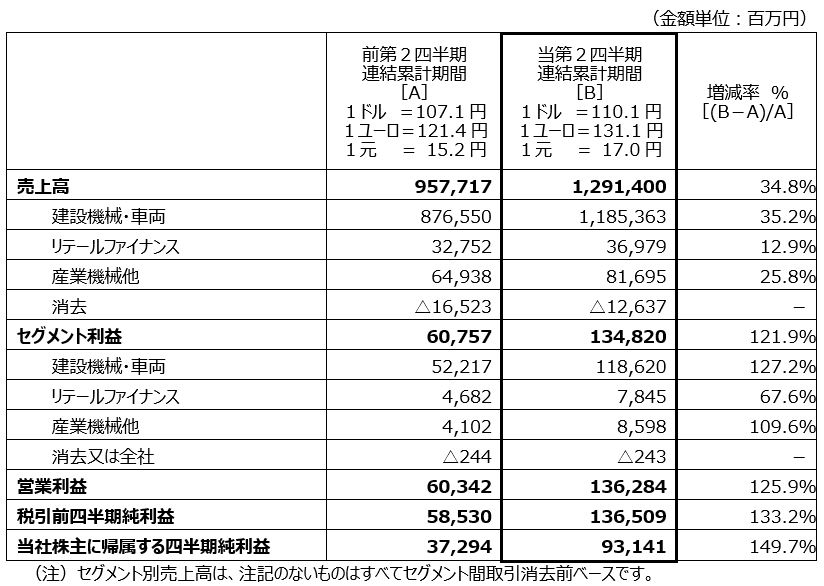 利益については、建設機械・車両部門における各地域での販売量増加や販売価格の改善、円安の影響により、営業利益は1,362億円(前年同期比125.9%増加)となりました。売上高営業利益率は前年同期を4.3ポイント上回る10.6%、税引前四半期純利益は1,365億円(前年同期比133.2%増加)、当社株主に帰属する四半期純利益は931億円(前年同期比149.7%増加)となりました。