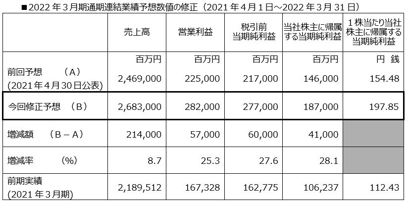 2021年4月30日に公表しました2022年3月期の連結業績予想を修正いたしました。詳細は、本日公表しました「連結業績予想および配当予想の修正に関するお知らせ」をご覧ください。