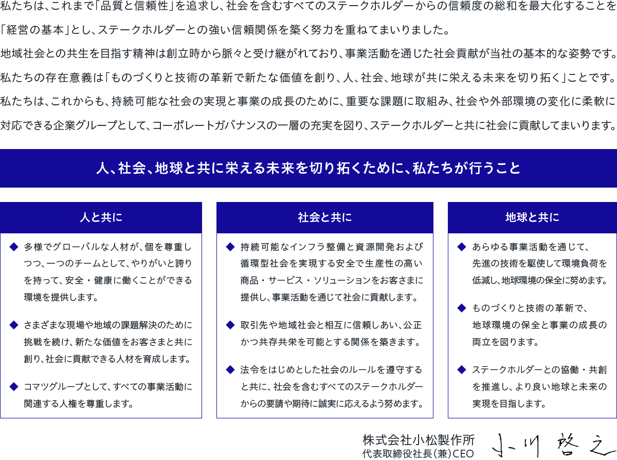 コマツはこれからも、持続可能な社会の実現と事業の成長のために、重要な課題に取り組み、社会や外部環境の変化に柔軟に対応できる企業グループとして、コーポレートガバナンスの一層の充実を図り、ステークホルダーと共に社会に貢献してまいります。