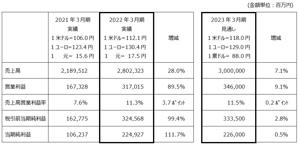 利益については、建設機械・車両部門において、資材価格や物流コスト上昇の影響はあるものの、各地域での販売量増加や販売価格の改善、円安の影響により、営業利益は3,170億円(前期比89.5%増加)となりました。売上高営業利益率は前期を3.7ポイント上回る11.3%、税引前当期純利益は3,245億円(前期比99.4%増加)、当社株主に帰属する当期純利益は2,249億円(前期比111.7%増加)となりました。