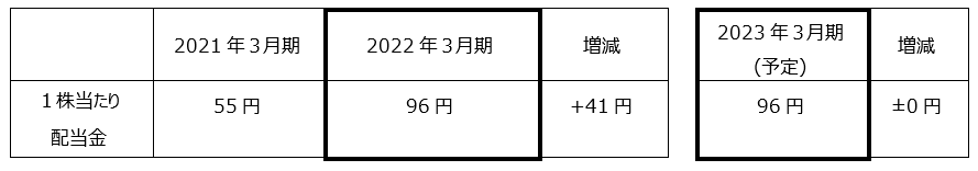当期の配当金については、当期の業績及び今後の事業展開等を勘案し、期末配当金は、前回の配当予想40円から1株につき16円の増額を予定しています。これにより当期末の配当金は56円となります。当期の年間配当金は、既に実施している第2四半期末の配当とあわせ、1株につき96円となり、前期(2021年3月期)実績から41円増配、連結配当性向は40.3%となります。第153回定時株主総会(本年6月21日に開催予定)に提案する予定です。