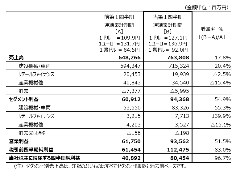 利益については、資材価格や物流コスト上昇の影響はあるものの、建設機械・車両部門における各地域での販売価格の改善や円安の影響により、営業利益は936億円(前年同期比51.5%増加)となりました。売上高営業利益率は前年同期を2.7ポイント上回る12.2%、税引前四半期純利益は1,125億円(前年同期比83.0%増加)、当社株主に帰属する四半期純利益は805億円(前年同期比96.7%増加)となりました。