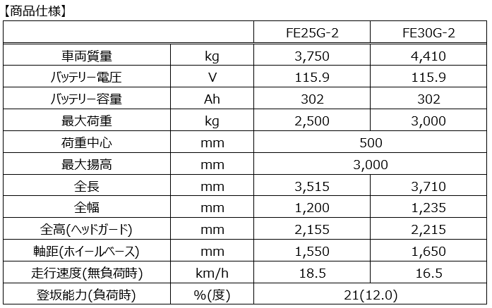 当該機は、FE25-2、FE30-2の特長はそのままに、急速充電による充電時間短縮と継ぎ足し充電が可能になったことで、電動式フォークリフトの導入が難しいとされてきた長時間稼働や高負荷作業が必要とされる現場でも連続作業が可能な電動式フォークリフトです。