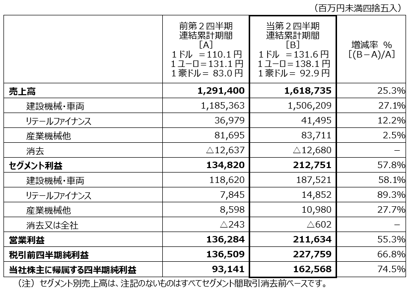 利益については、資材価格や物流コスト上昇の影響はあるものの、建設機械・車両部門における各地域での販売価格の改善や円安の影響により、営業利益は2,116億円(前年同期比55.3%増加)となりました。売上高営業利益率は前年同期を2.5ポイント上回る13.1%、税引前四半期純利益は2,278億円(前年同期比66.8%増加)、当社株主に帰属する四半期純利益は1,626億円(前年同期比74.5%増加)となりました。