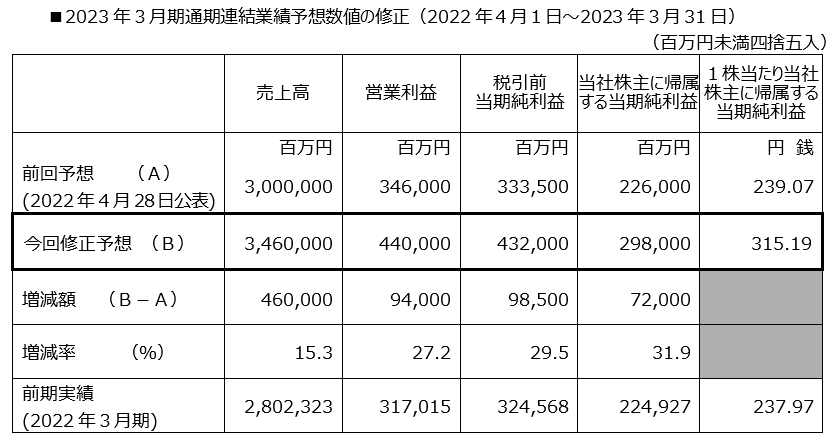 2022年4月28日に公表しました2023年3月期の連結業績予想を修正いたしました。詳細は、本日公表しました「連結業績予想および配当予想の修正に関するお知らせ」をご覧ください。