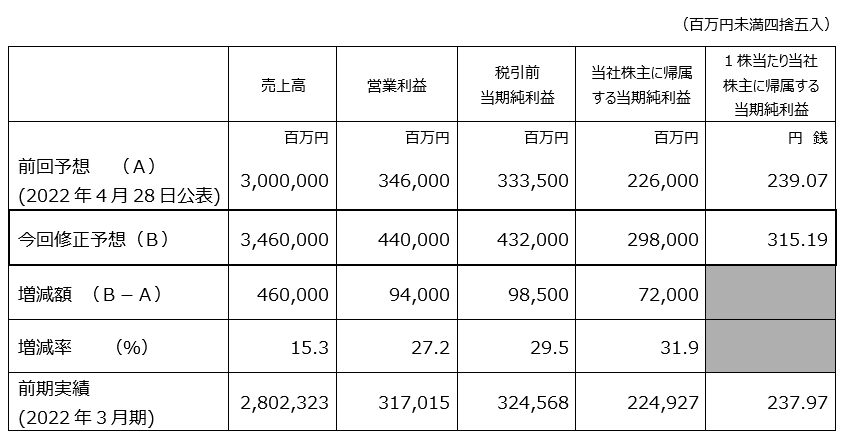 また、為替が想定より円安に推移しているため、業績予想の前提となる為替レートの見直し(下期平均の為替レートを1米ドル=140円、1ユーロ=137円、1豪ドル=89円に変更)を行い、本年4月28日に公表しました通期連結業績予想につき、売上高及び利益を修正いたします。