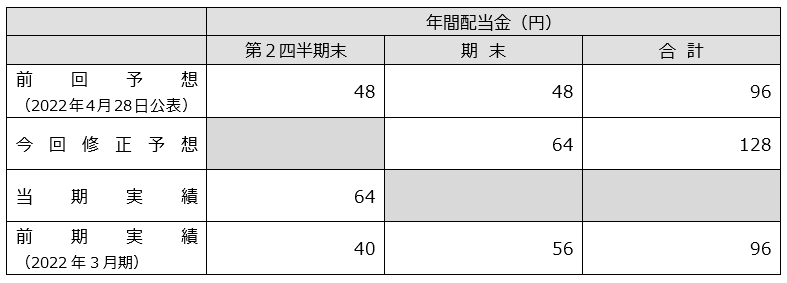 このような基本方針のもと、当第2四半期末の配当金につきましては、当第2四半期末までの業績ならびに今後の事業展開を勘案し、本年4月28日に公表した前回予想から16円増額し、1株につき64円といたします。なお、期末配当金の予想についても、前回予想から16円増額し、1株につき64円に修正いたします。これにより、当期の年間配当金は、1株当たり128円となり、前期(2022年3月期)実績から32円増配、連結配当性向は40.6%となる予想です。