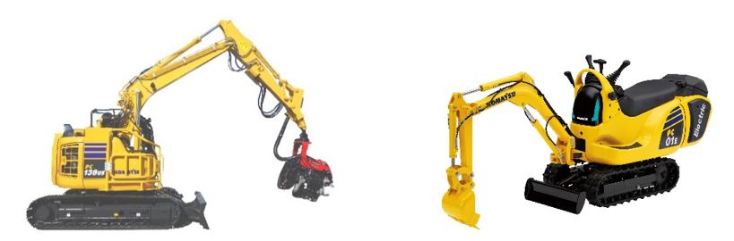 【写真左:PC138US-11ハーベスターC93仕様、写真右:電動マイクロショベル PC01E-1】