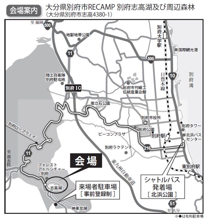 会場:大分県別府市志高4380-1 BECAMP別府志高湖及び周辺森林 コマツブースは「B20」