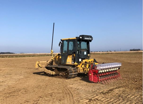 農業用ブルドーザーを用いた大規模圃場での播種作業の様子
