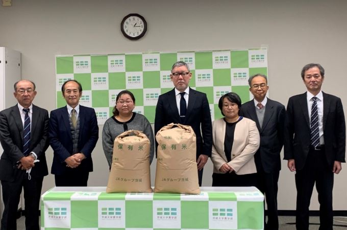 コマツ(社長:小川啓之)は、茨城大学(学長:太田寛行)農学部とともに、2020年より農業用ブルドーザーを用いた乾田直播水稲栽培の共同研究を進めており、このたび実証実験によって新米約24トンを収穫しました。共同研究では茨城県稲敷市内の5.6ヘクタールの土地を大規模圃場として整地、圃場1ヘクタールあたり4.2トンの収穫量となり、昨年同圃場で収穫した1ヘクタールあたり3.6トンに対し、約20%上回る結果となりました。11月4日に茨城大学阿見キャンパスにて、地域において食の支援を必要とする方々や学生へ収穫米を寄贈する贈呈式を開催し、茨城県内の子ども食堂などの各種団体などを通じて提供しました。