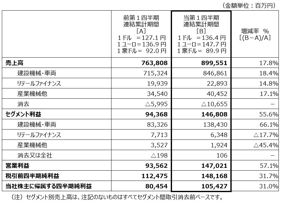 コマツは、本日2024年3月期第1四半期決算を公表しました。概要は以下のとおりです。