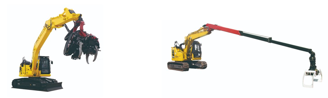 【写真左:PC170LC-11ハーベスターC93仕様、写真右:PC138US-11ロングリーチグラップル仕様】